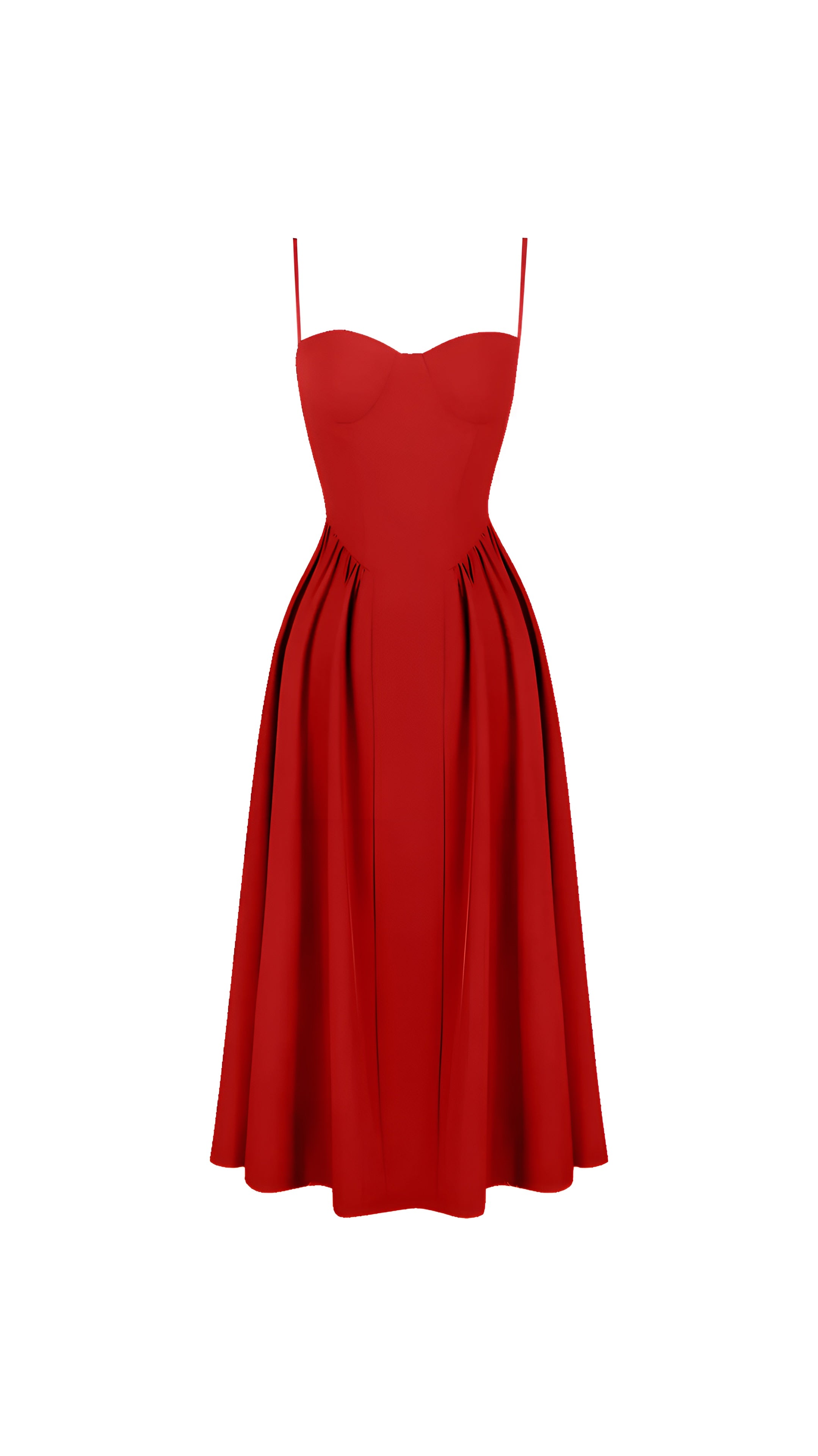 The Kara Dress is a timeless midi-length design that combines elegance and simplicity. With its structured bustier top and delicate spaghetti straps, it offers a flattering silhouette perfect for formal occasions, weddings, or sophisticated evenings out. The soft pleating adds graceful movement to the dress, creating an effortlessly chic look.