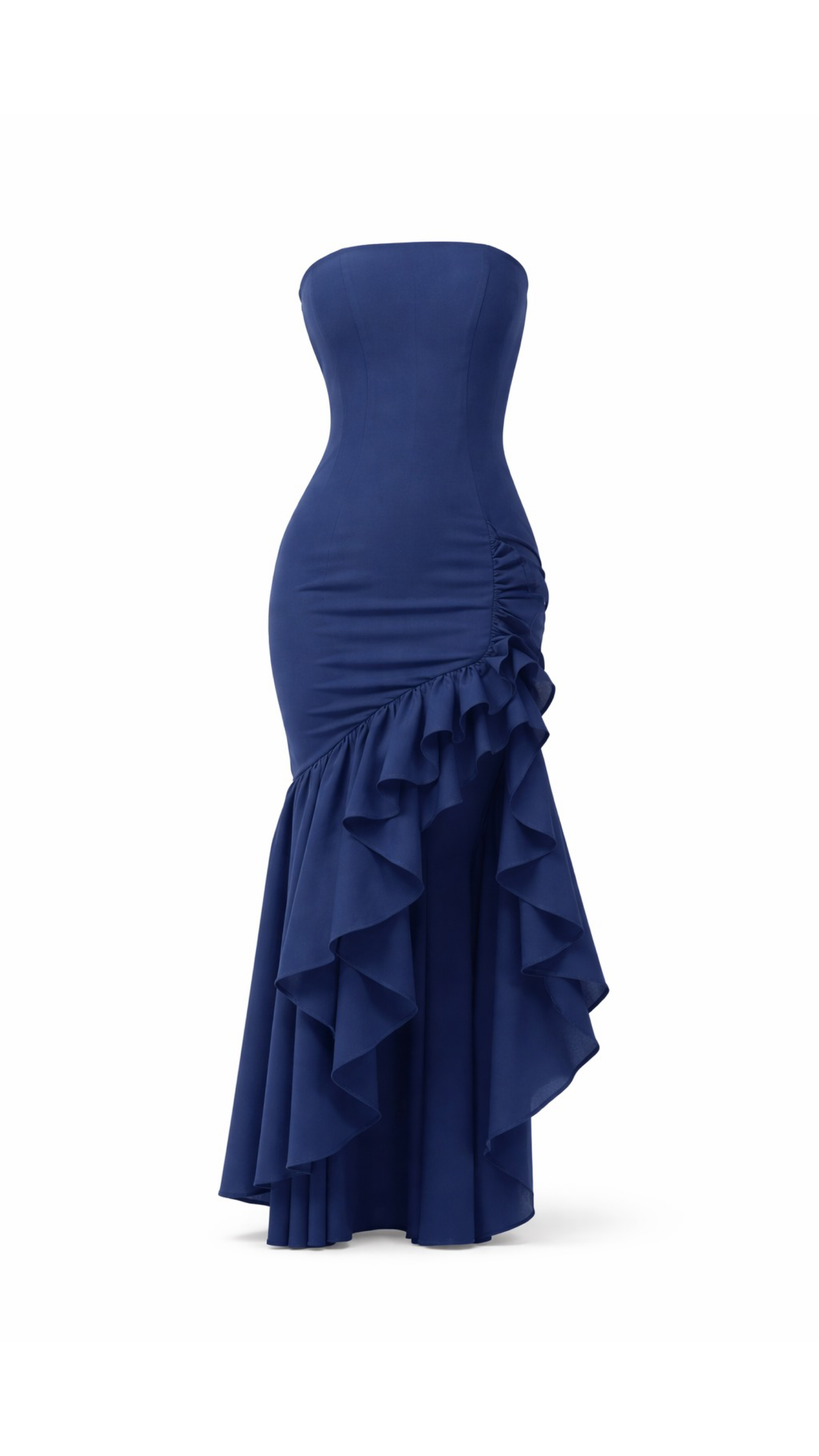 Turn heads in the Lizzie Maxi Dress, a striking silhouette designed to flatter every curve. This strapless design features a sleek, body-contouring fit that hugs the waist and hips before cascading into dramatic layered ruffles. The asymmetrical hemline and thigh-high slit add movement and allure, creating the perfect balance between elegance and statement style.