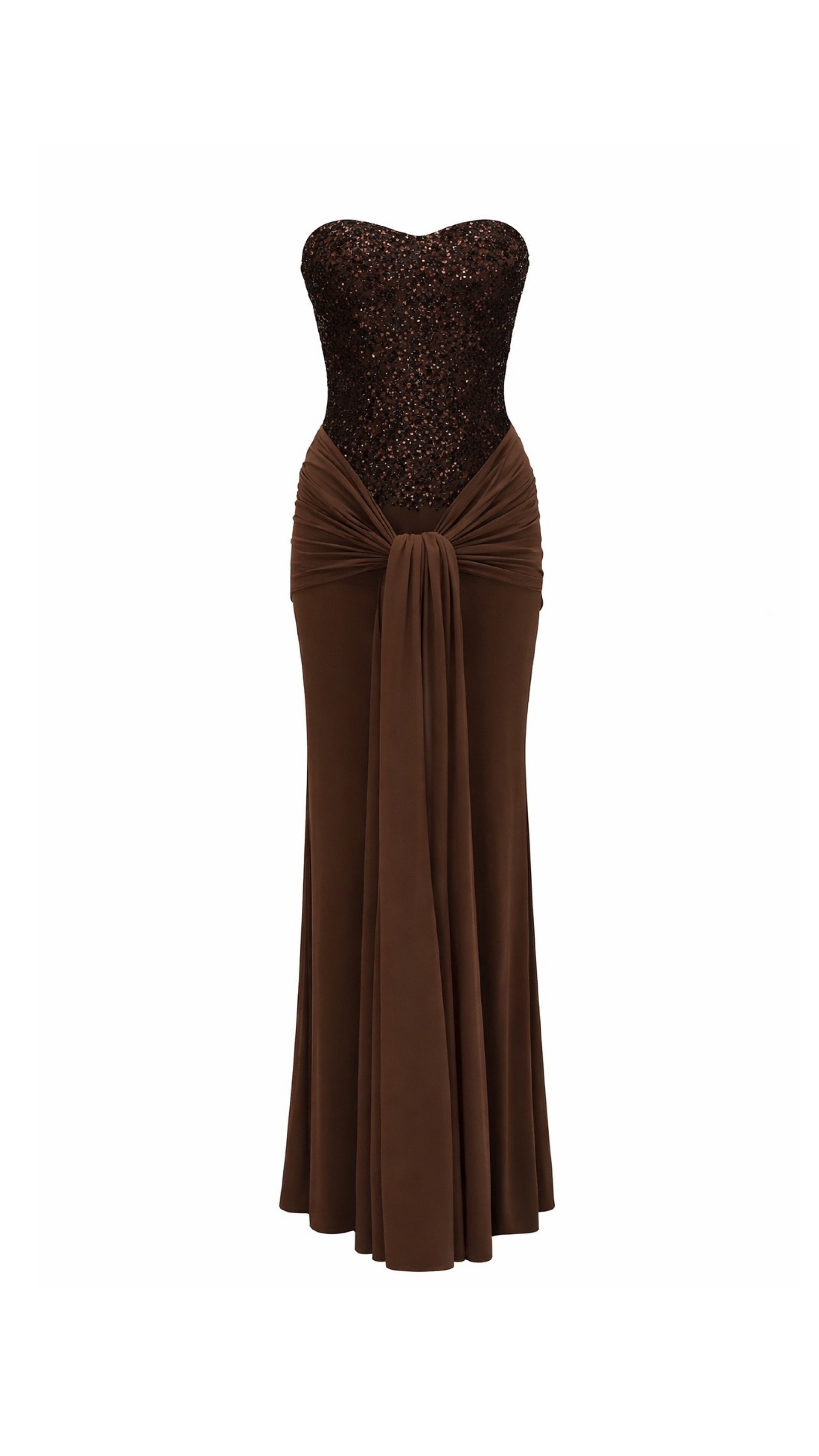 The Bianca Maxi Dress is the definition of understated glamour. Designed with a strapless, sculpted bodice adorned in delicate shimmering embellishments, it contours the figure while offering a refined, elegant finish. The softly draped waist detail cinches and flatters, flowing into a fluid, floor-length skirt that moves beautifully with every step.